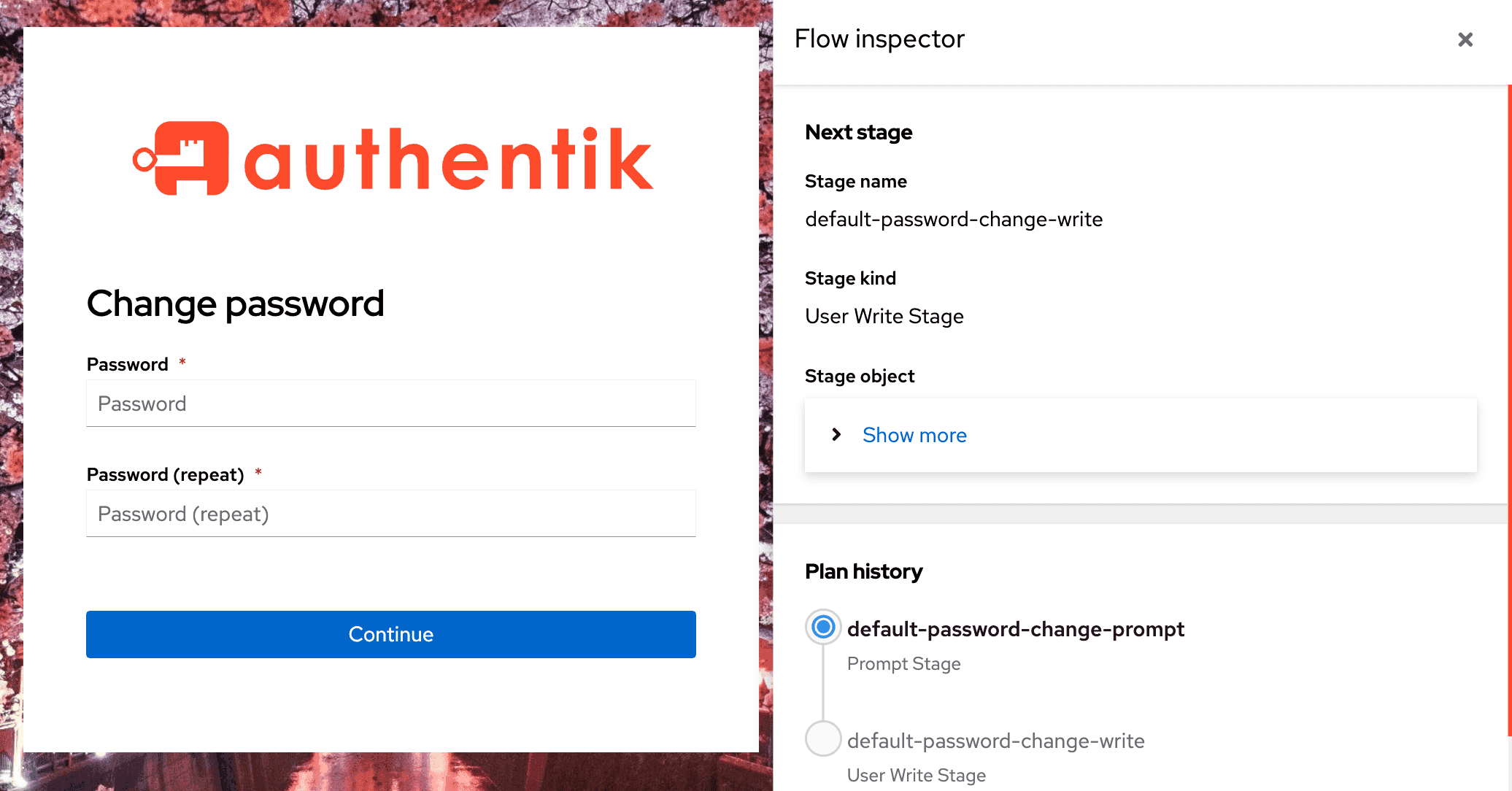 As shown in the screenshot below, the Flow Inspector displays to the right, beside the selected flow (in this case, "Change Password"), with information about that specific flow and flow context.